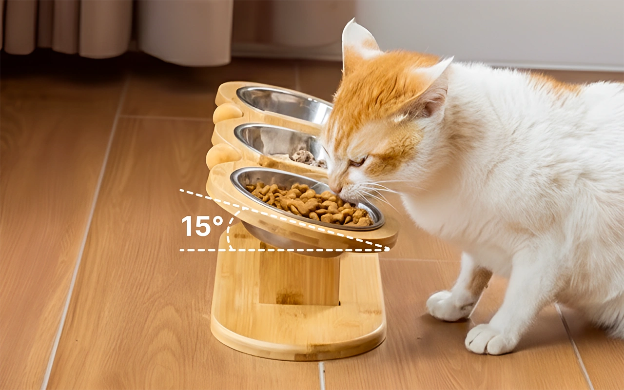 Eating at a tilt helps cats swallow easily and comfortably. This reduces choking, bloating and helps their body take in nutrients.