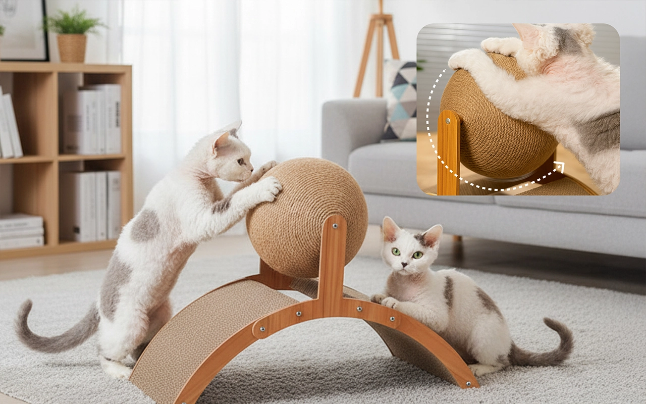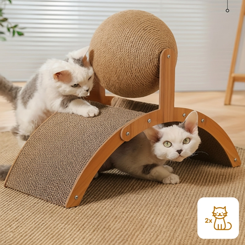 Curved bridge and spinning ball give endless excitement. Cats explore, scratch, and relax with every use.