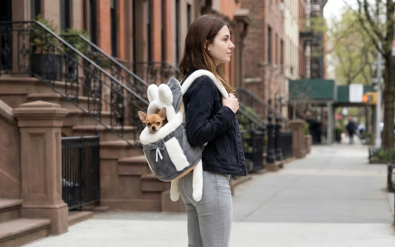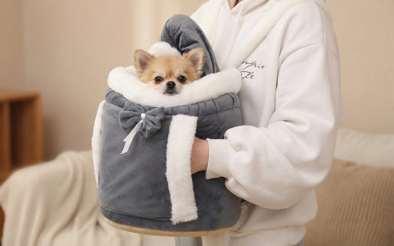 I use this fluffy carrier on the bus with my small dog. She stays calm inside, wrapped in soft lining, and people keep saying how cute it looks.