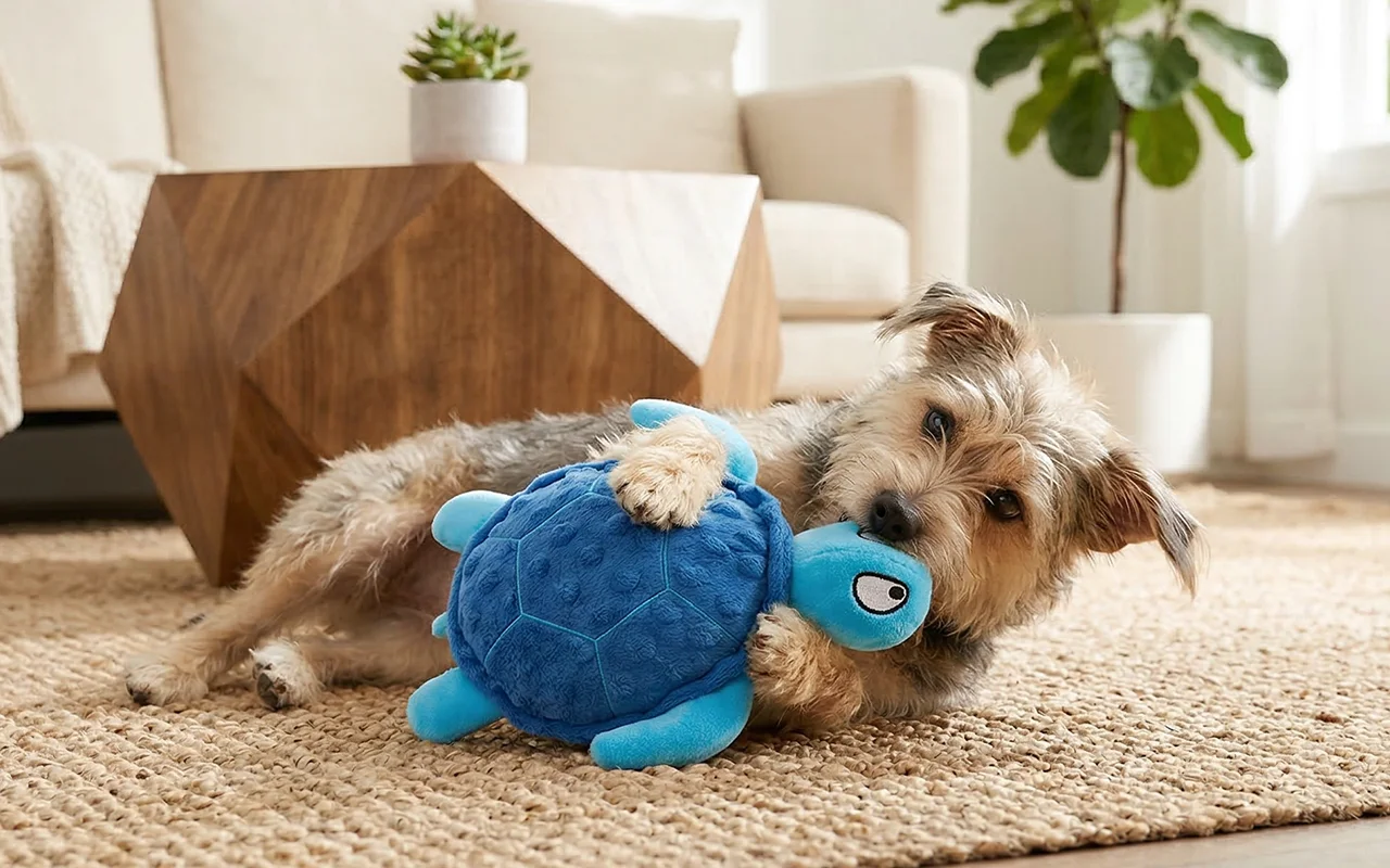 Our dog usually destroys toys in hours, but this turtle holds up surprisingly well. The mix of squeak and crinkle keeps him entertained all evening.