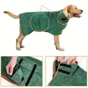 This bathrobe has made drying my dog so much quicker and easier. The microfiber fabric is super absorbent. The robe also stays in place thanks to the convenient straps. Cleaning it is a breeze as well!