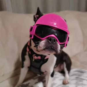 Our dog helmet and goggles are designed with chin and head straps. They will fit snugly on your dog and stay in place during rides.
