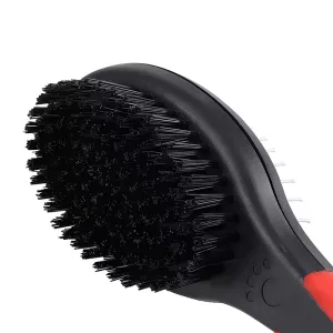 On one side, dense bristles efficiently remove loose hair and detangle knots. The other side provides a soft bristle brush, perfect for finishing and smoothing the coat.