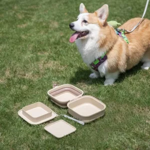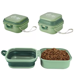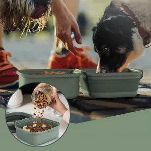 Really happy with this travel bowl for my boxer. Food in one side, water in the other. Folds down quickly and seems pretty durable.