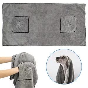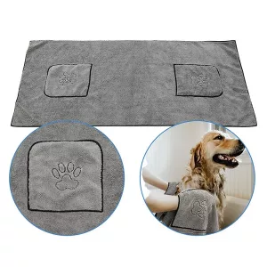 Our bath towel has two pockets, which allows for an easy drying process. You can insert your hands into the pockets to rub down your pet thoroughly.