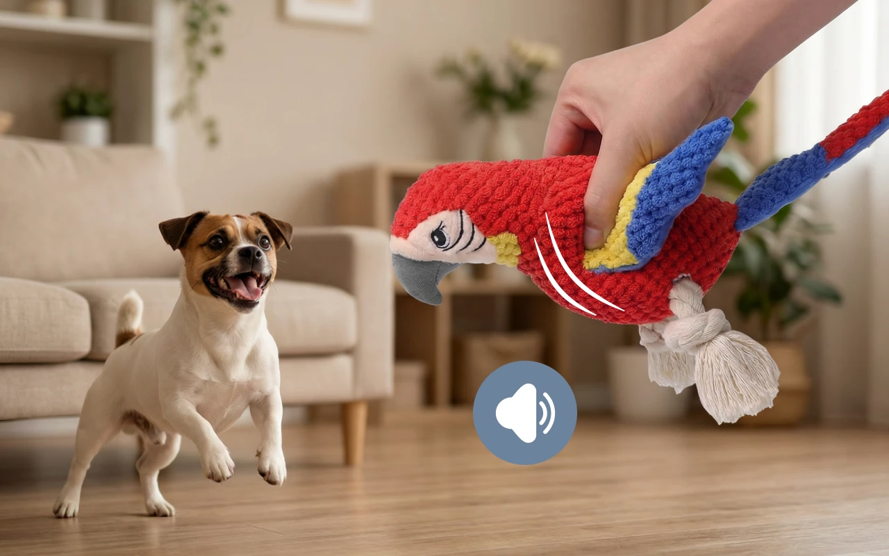 My puppy lights up whenever I toss the parrot his way! The squeaks make him so excited, and he plays until he’s ready for a nap.