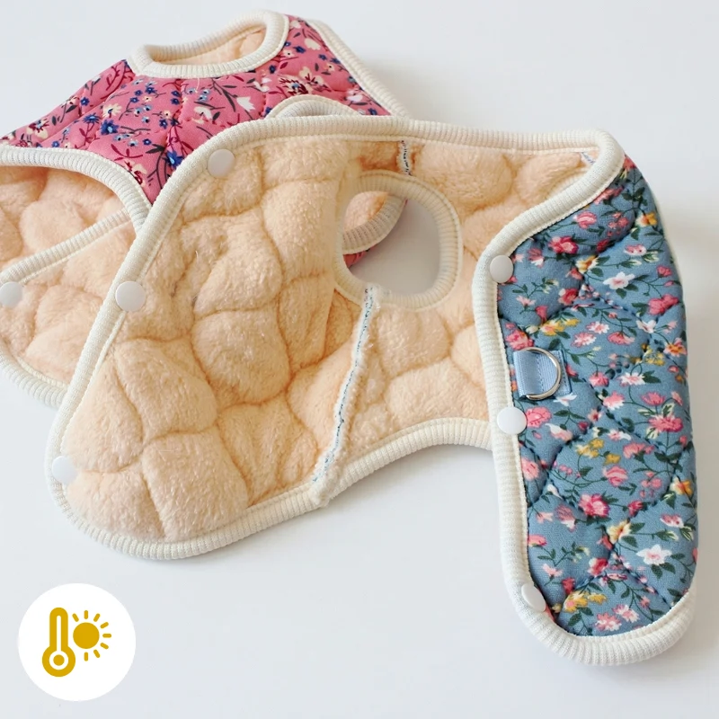 This cozy jacket keeps my dog warm and he looks adorable in the flower design. Putting it on takes just a second. Love it for walks!